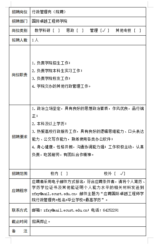 国际卓越工程师学院行政管理岗招聘启事(院聘)